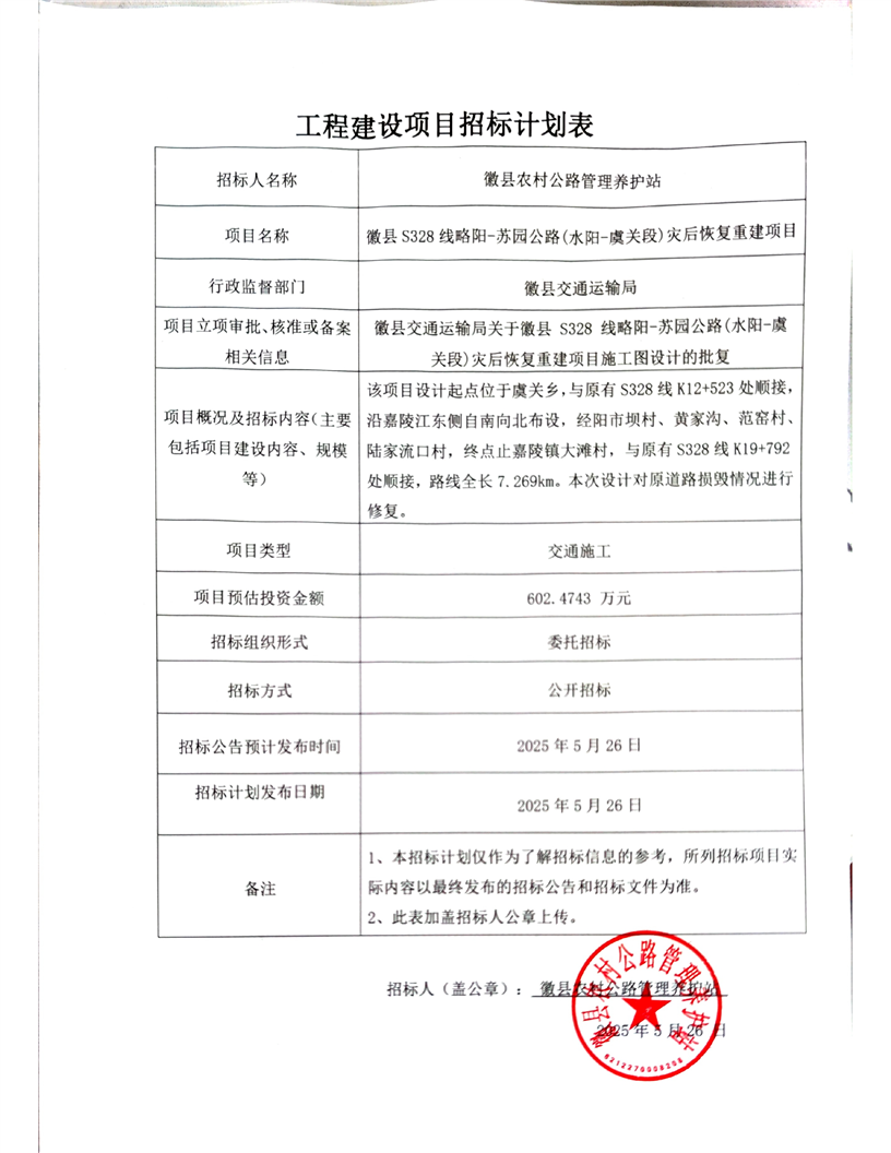 徽縣S328線略陽-蘇園公路(水陽-虞關(guān)段)災(zāi)后恢復(fù)重建項目