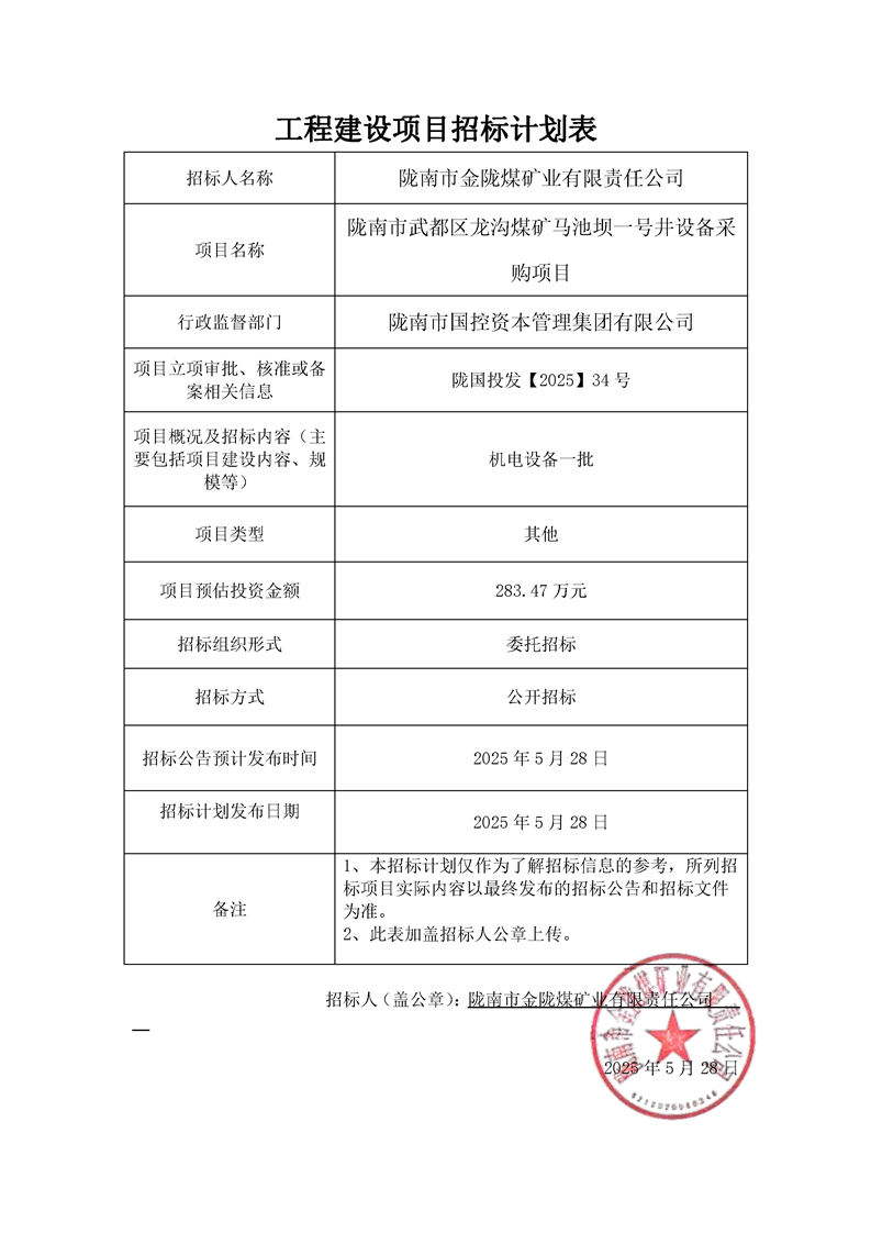 隴南市武都區(qū)龍溝煤礦馬池壩一號井設(shè)備采購項目