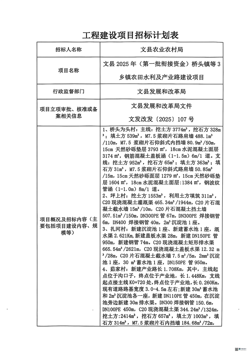文縣2025年(第一批銜接資金)橋頭鎮(zhèn)等3鄉(xiāng)鎮(zhèn)農(nóng)田水利及產(chǎn)業(yè)路建設(shè)項目
