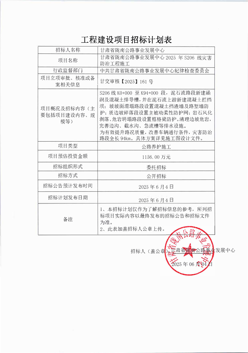 甘肅省隴南公路事業(yè)發(fā)展中心2025年S206線災(zāi)害防治工程施工