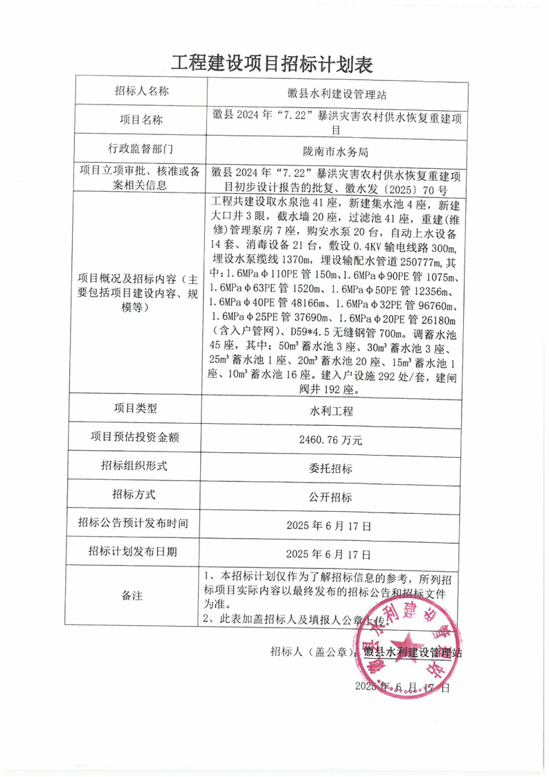 徽縣2024年“7.22”暴洪災害農村供水恢復重建項目