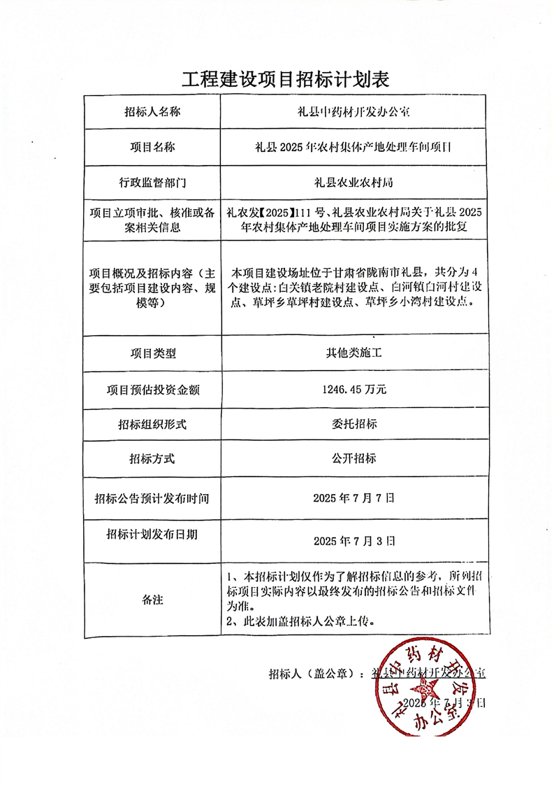 禮縣2025年農(nóng)村集體產(chǎn)地處理車間項目