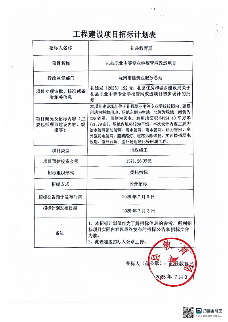 禮縣職業(yè)中等專業(yè)學(xué)校管網(wǎng)改造項目
