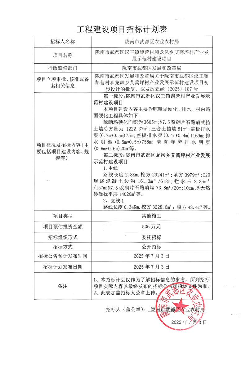 隴南市武都區(qū)漢王鎮(zhèn)黎營(yíng)村和龍鳳鄉(xiāng)艾蒿坪村產(chǎn)業(yè)發(fā)展示范村建設(shè)項(xiàng)目