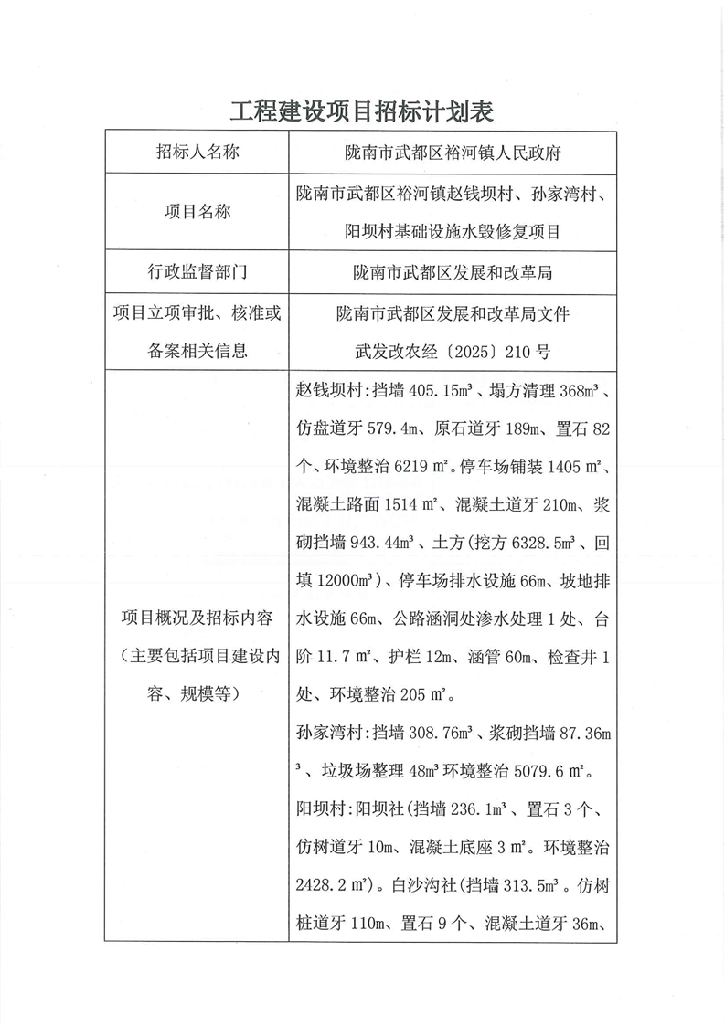 隴南市武都區(qū)裕河鎮(zhèn)趙錢壩村、孫家灣村、陽壩村基礎(chǔ)設(shè)施水毀修復(fù)項目